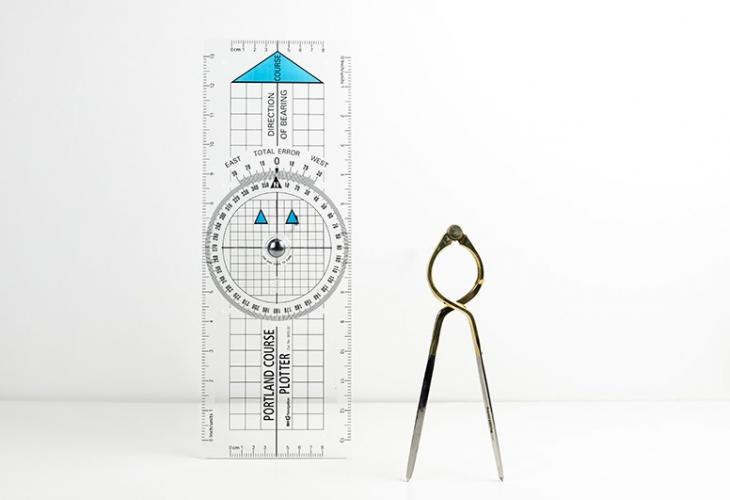 De Portland koersplotter is nodig voor het bepalen van coördinaten en koersen. Met de messing kaartpasser kan je met één hand de passerpunten van elkaar en naar elkaar toe bewegen.